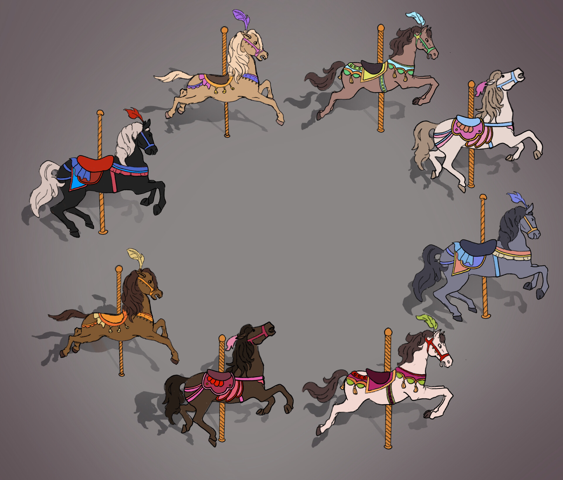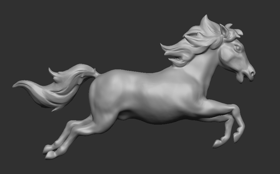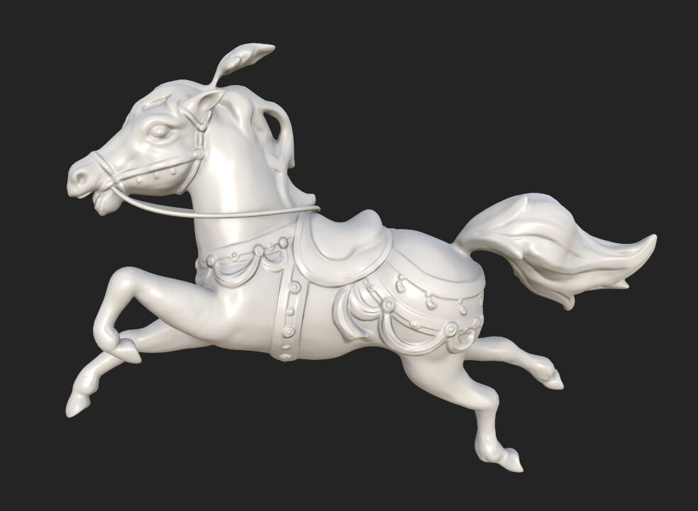 I started off by creating low poly horse models using blender, referencing images of real horses. I then created an armature and posed each of the horses, creating three different poses total, which would each be used three times; creating nine horses. I quickly realized, however, that my horses were missing a key element that carousel horses possess, which is the fact that they are small and pony-like. Before getting too far into the sculpting process, I made sure to adjust the anatomy of the horses by shortening their torsos and making the heads larger, and therefore making them look more carousel/pony like.