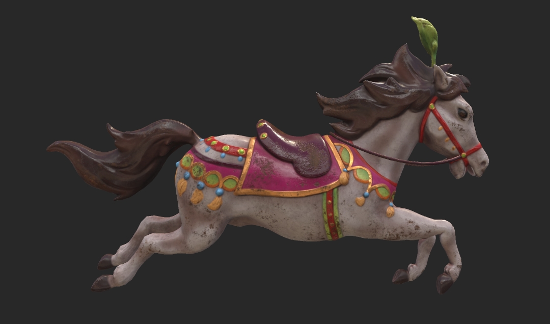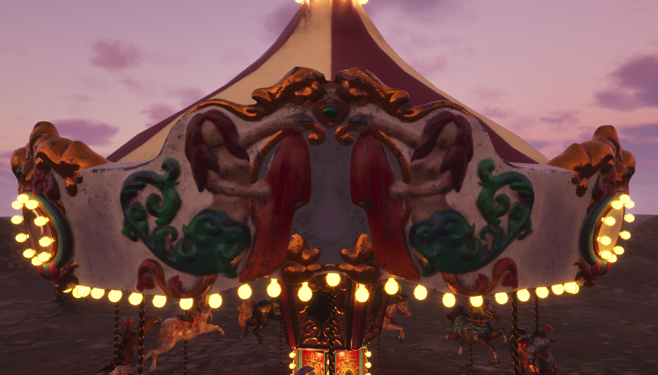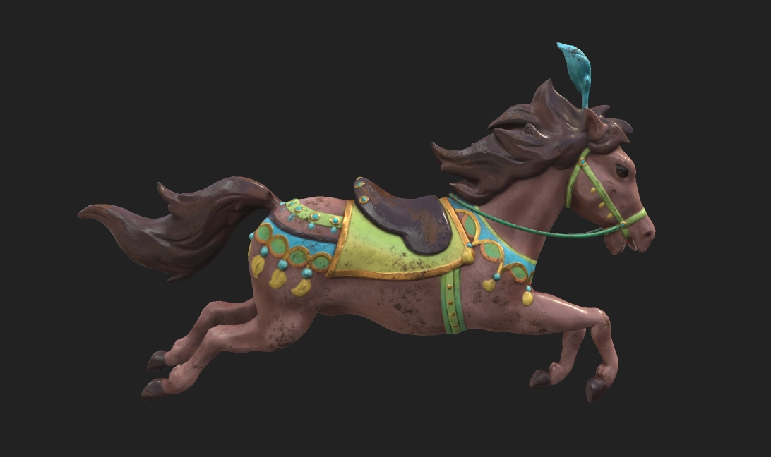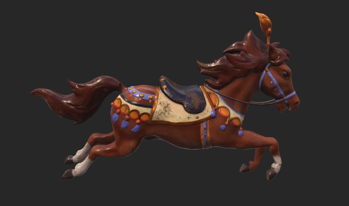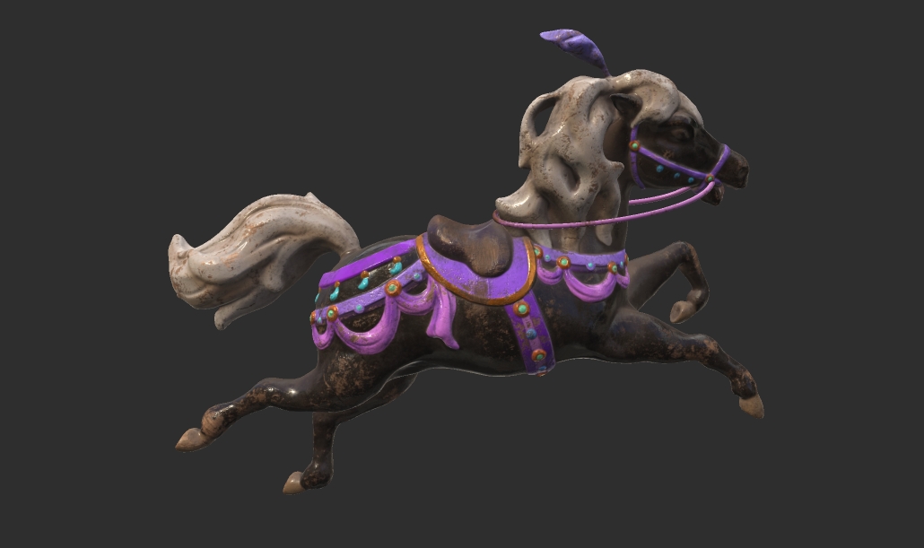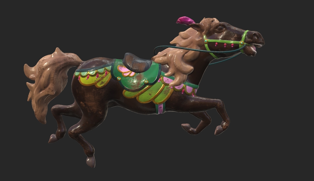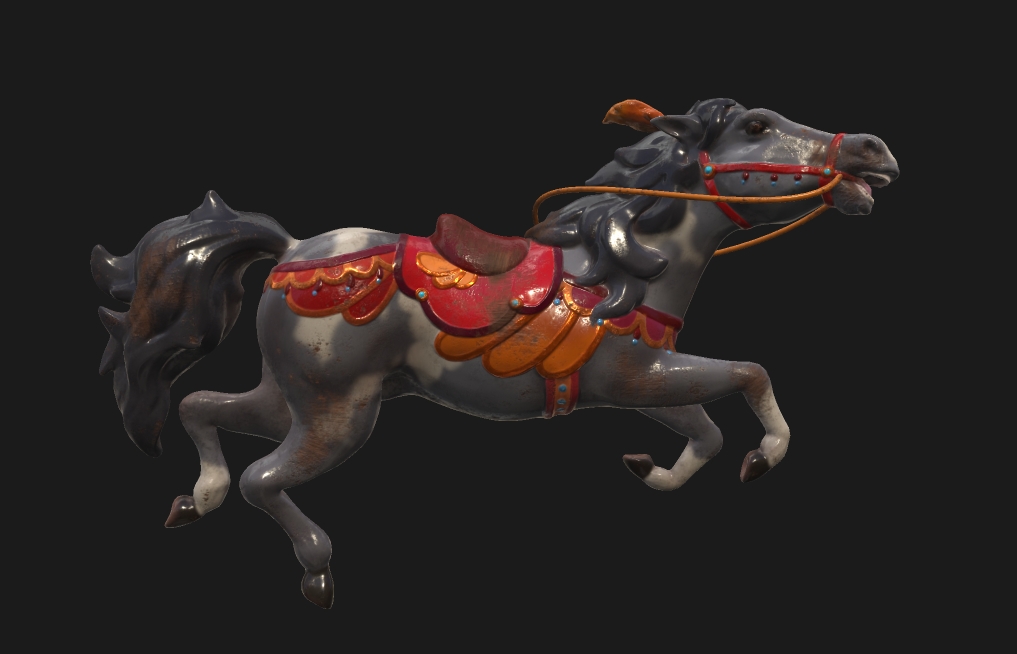 I wanted the look of this carousel to be abandoned but also well-loved. In order to accomplish this, I needed to layer lots of textures in order to create grime and wear. One particular element of wear that I wanted to convey was paint peeling to reveal wood underneath. This was done using masks and using a generator to expose sections of the paint, and then went through and manually peeled away parts were there would be more wear.