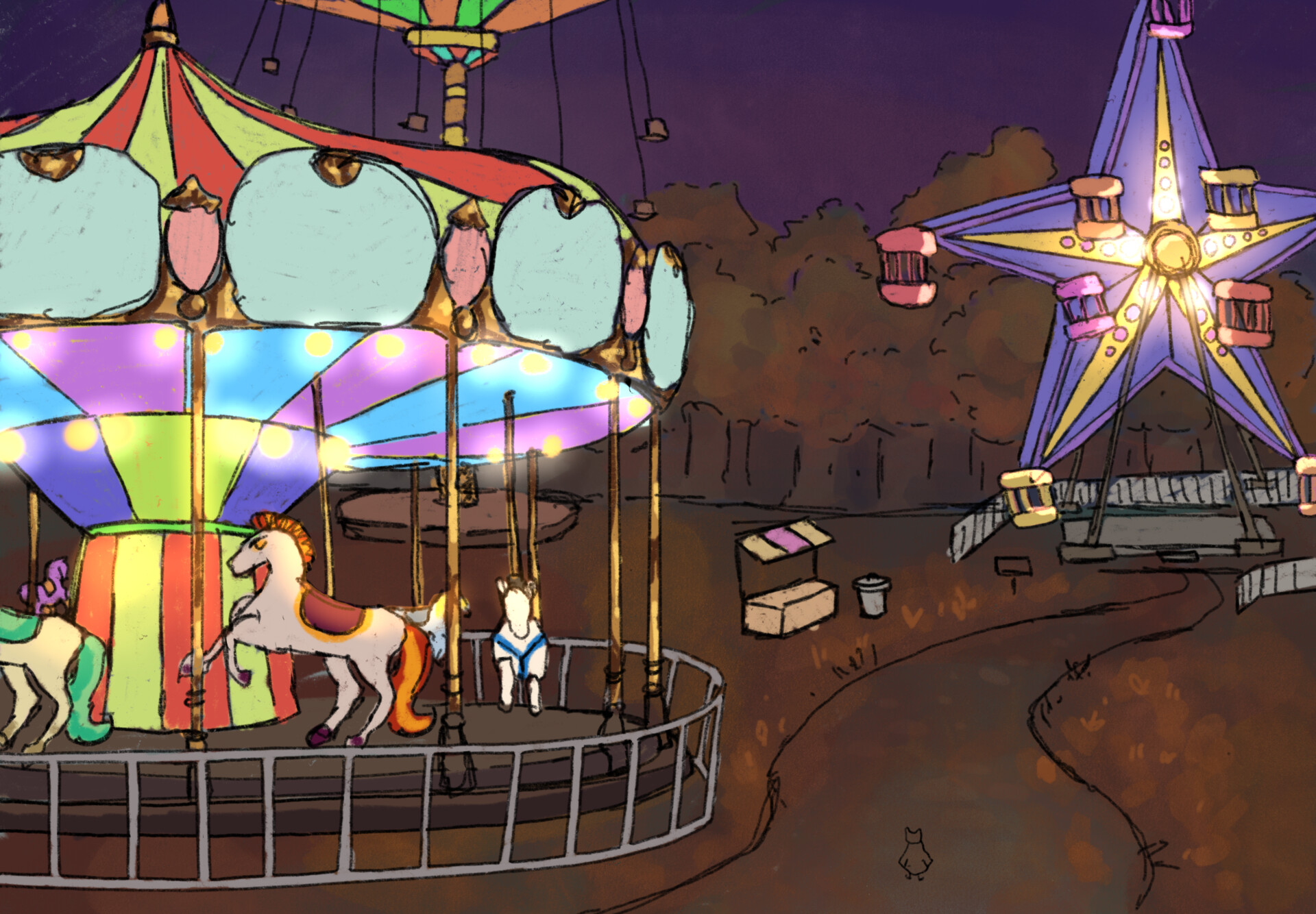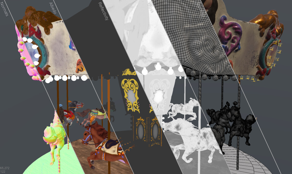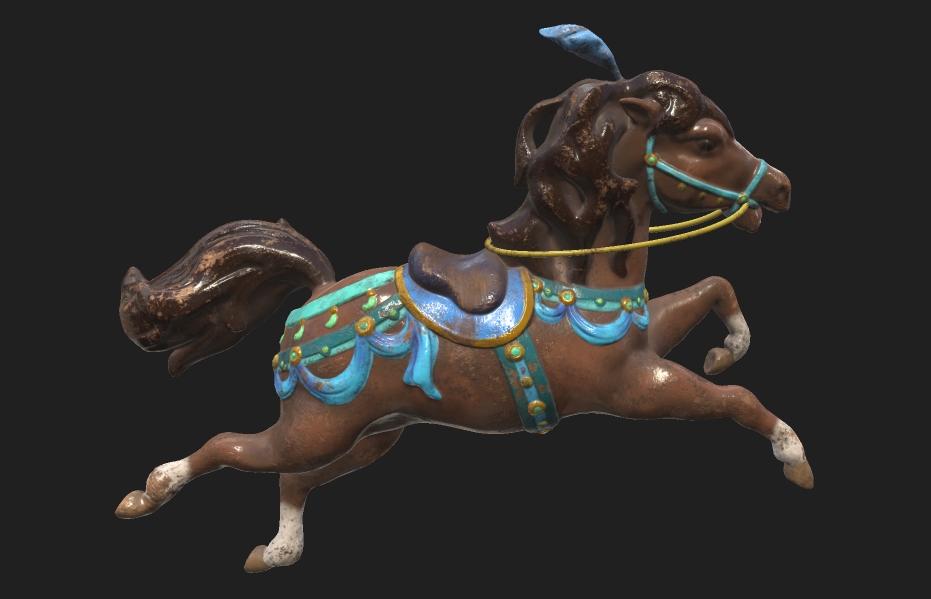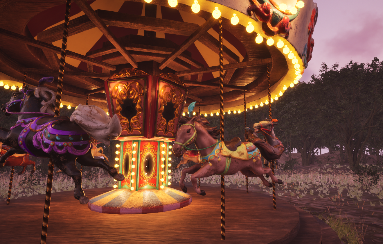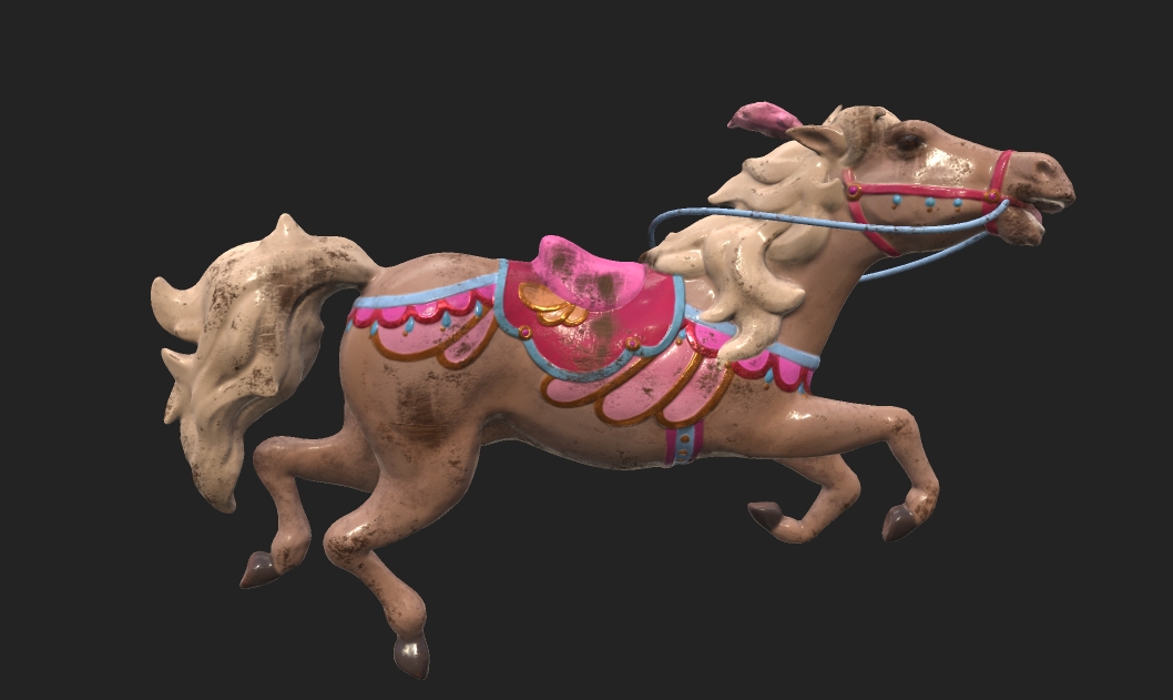 I wanted the look of this carousel to be abandoned but also well-loved. In order to accomplish this, I needed to layer lots of textures in order to create grime and wear. One particular element of wear that I wanted to convey was paint peeling to reveal wood underneath. This was done using masks and using a generator to expose sections of the paint, and then went through and manually peeled away parts were there would be more wear.