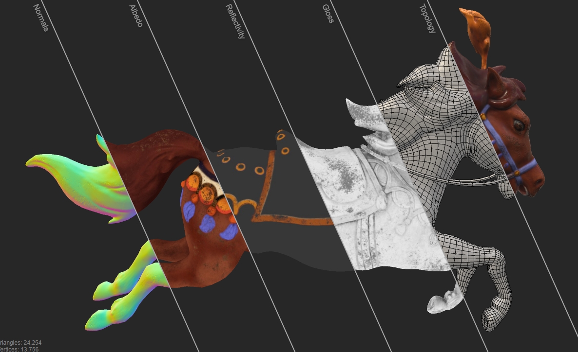 After the sculpting was done, I created high and low poly models as well as uvs, and then baked them in Substance 3D Painter. I was pleasantly surprised with how the results of the bake turned out, as that had been an issue I struggled with in the past. Creating this project has given me a better understanding of geometry and uvs and how they are important to creating the materials, and therefore I was able to get it done right the first time. After baking, I then began to paint the base colors on to each of the horses, now having nine different unique texture sets. Towards the end, I added more details like some metallic elements to create striking gold details, as well as experimenting with the roughness to make the paint on the horse look glossy while the grime overlays were more matte.
