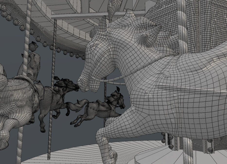 In the creation of the carousel itself, most of the model was basic hard surfaced shapes. However, I wanted to include a lot of sculpture and detail just like the horses had. I made low poly panels that I brought into Zbrush and hand sculpted detail there, then created low poly versions of those.