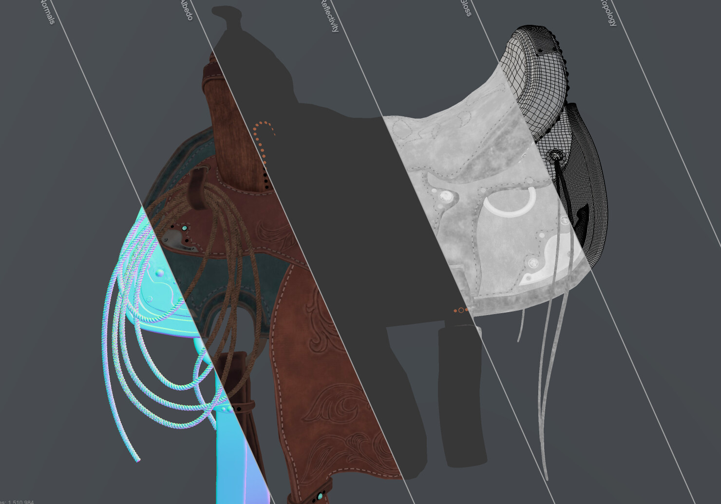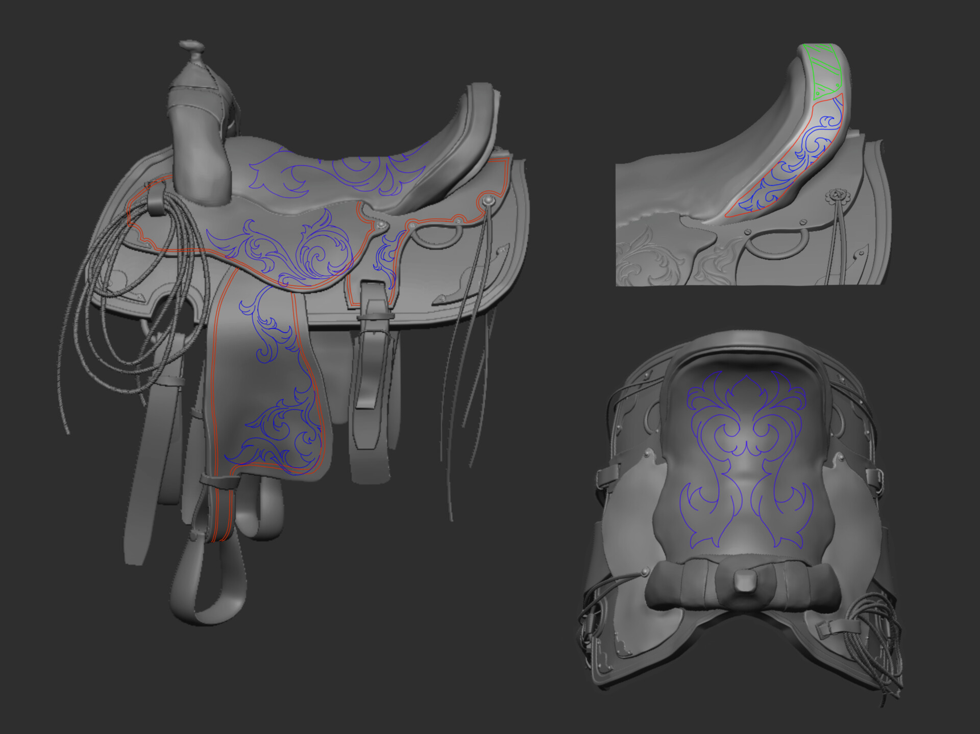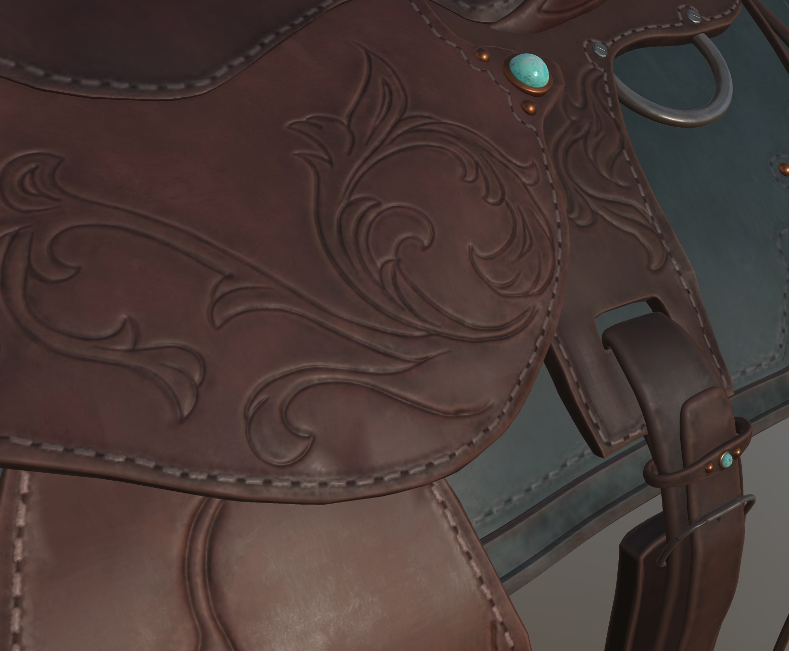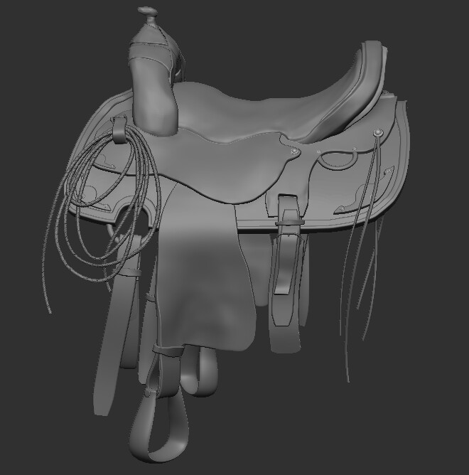 The low poly model was created mostly in blender. After drawing out where I wanted the designs, taking inspiration from real western saddles and traditional leatherwork, I brought it into Zbrush and hand sculpted those patterns.