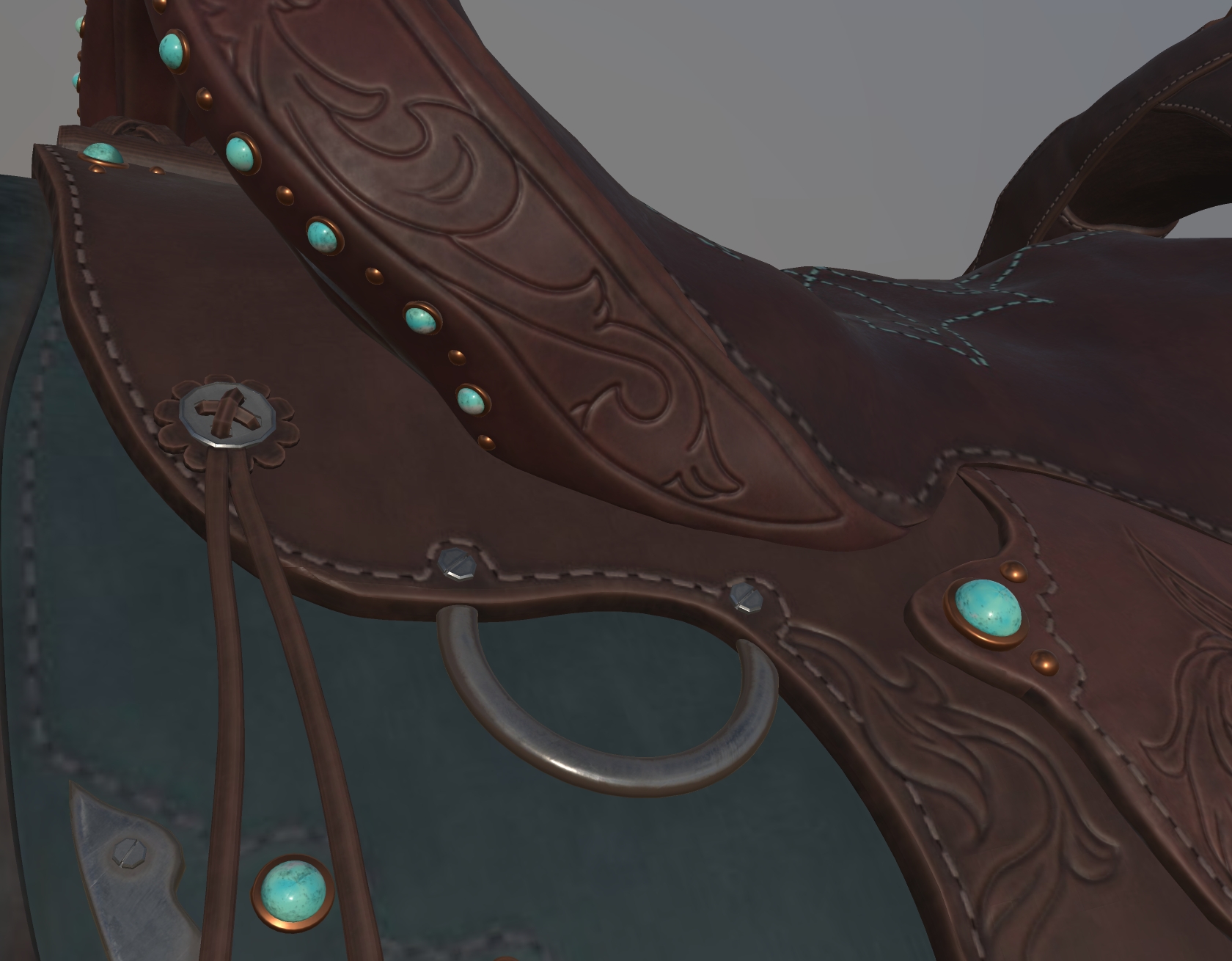 In the process of creating this saddle, I quickly realized how detailed and complicated the anatomy of the saddle really is. Something that greatly aided in my process was actually watching videos of how saddles are made in real life, using a base structure called a ‘tree’ and how each layer comes together one after another. I also made sure to include the more detailed elements, including metal hardware, strings, embellishments, gemstones, and a rope to make it more unique.